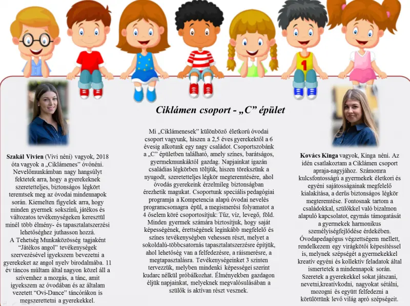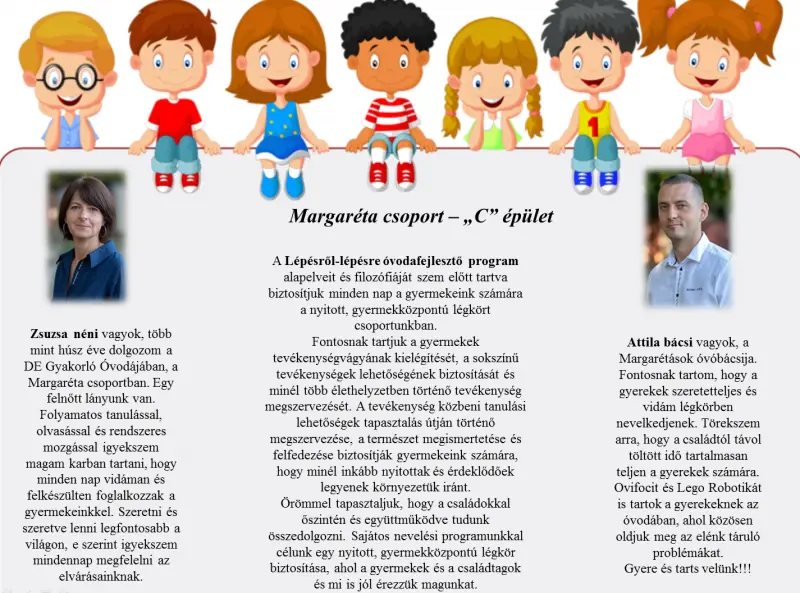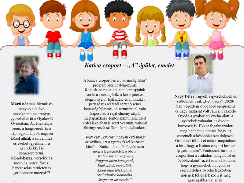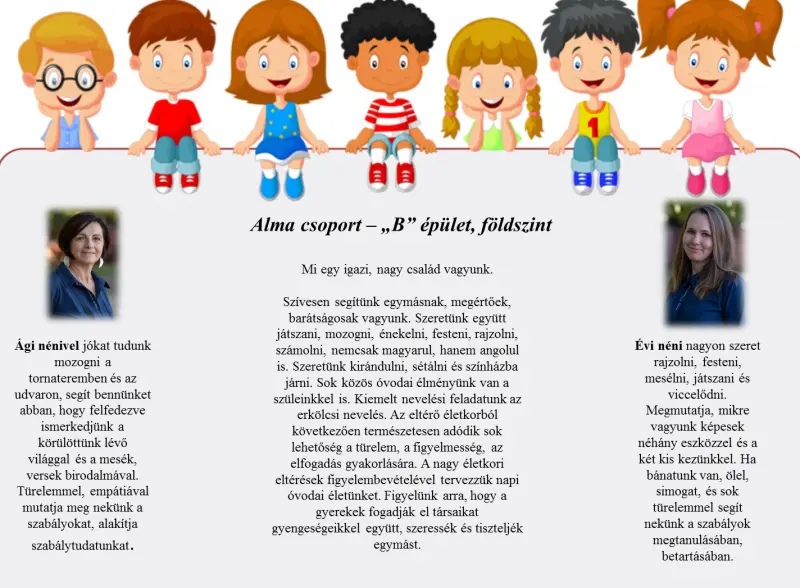A Katicások és a Margarétások azonos, míg az Almások és Ciklámenesek vegyes életkorú csoportokban várják a gyerekeket. Fogadjátok szeretettel a bemutatkozásukat.